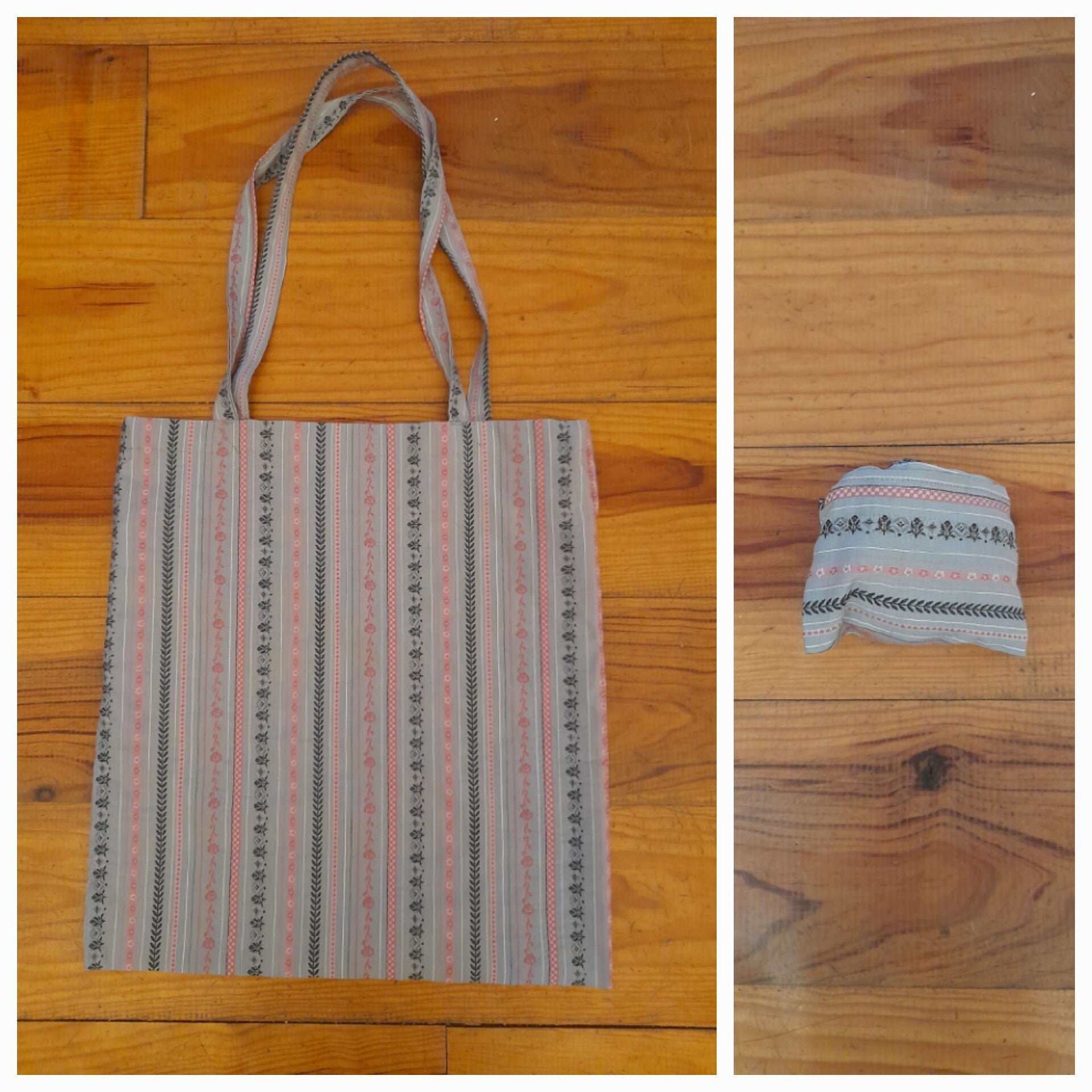 Un joli sac de courses à motifs muni d'une pochette interne. Le sac se glisse dans la pochette pour un minimum d'encombrement, vous le sortez ou le rentrez selon vos besoins. Chaque sac mesure 40 cm de côté et est unique.